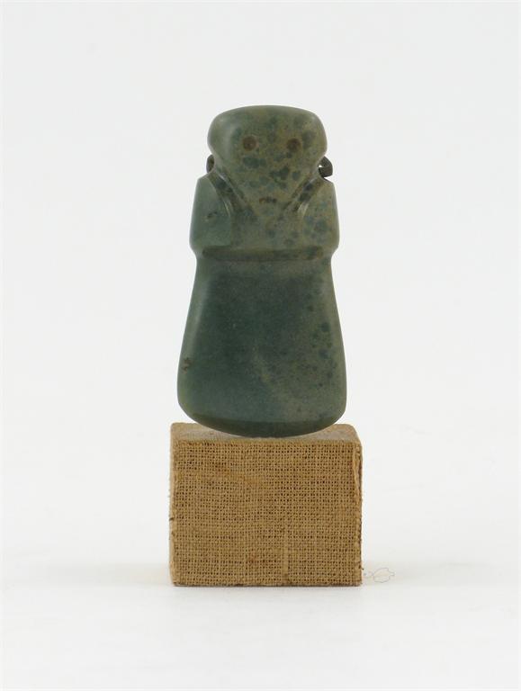 A jade or green stone axe-god pendant, the features boldly defined, probably pre-Columbian, 7.5cm. Provenance: The Ernest Ohly collection. Cf. R Keverne, Jade, p.325, fig.12 for a related figure.