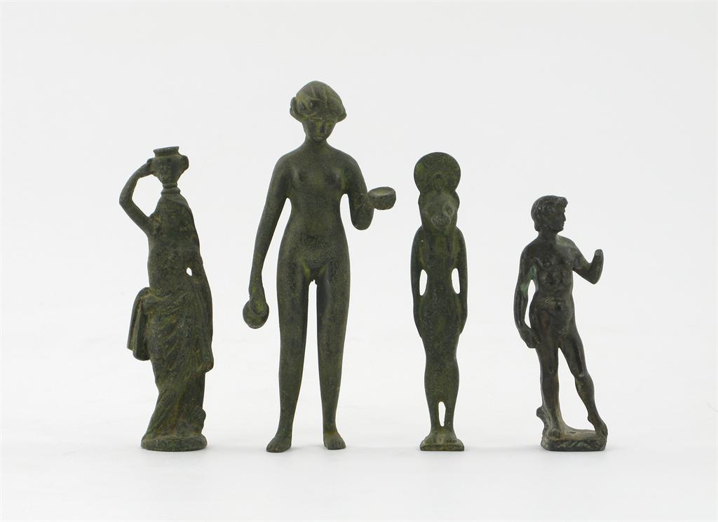 Four bronze figures, one of Sekhmed, another after Michelangelo's David, 16.5cm. (4)