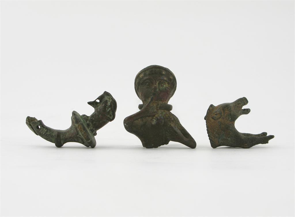 Three bronze fragments, one of a boar's head, another a panther and the third of a human, 7cm. (3) Provenance: The Ernest Ohly collection.