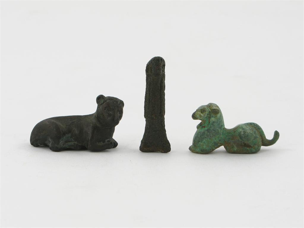 Three small bronze items, two of seated lions, 4cm max. (3) Provenance: The Ernest Ohly collection.