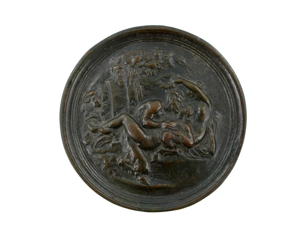 A circular bronze roundel, depicting an erotic scene of a woman and two satyrs, 15cm. Provenance: The Ernest Ohly collection.