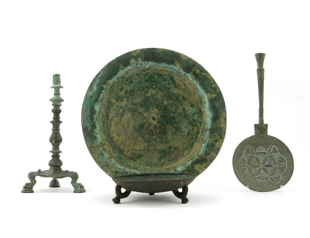 Four bronze items, comprising; a strainer spoon, a tripod bowl, a lamp base and a circular dish, 33cm max. (4) Provenance: The Ernest Ohly collection.