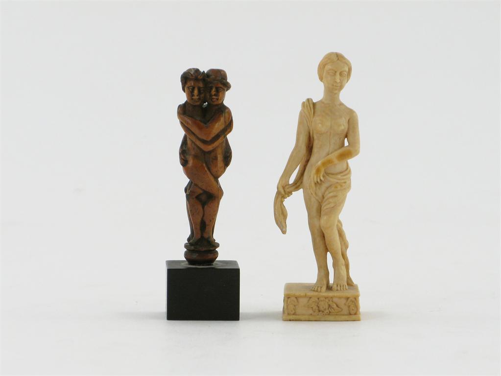 Two small ivory carvings, one of Aphrodite raised on a plinth carved with roses, the other of an amorous couple, 9cm max. (2) Provenance: The Ernest Ohly collection.