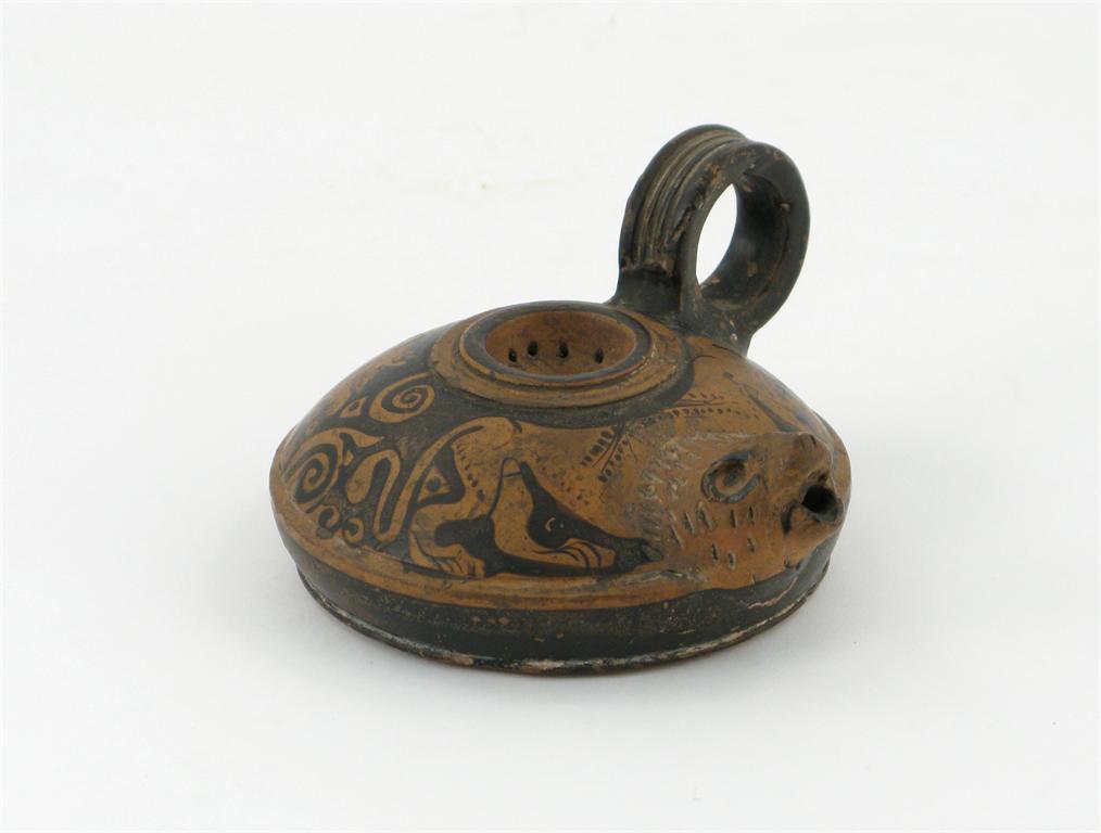 An Attic red figure guttus, decorated with panthers and with a single loop handle, probably c.4th century BC, minor damages, 12.5cm. Provenance: The Ernest Ohly collection.
