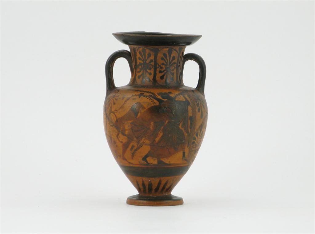 A Attic black figure amphora, one side decorated with warriors, the other with a man, a woman and a lion, perhaps depicting Peleus chasing Thetis, c.5th century BC, damaged and repaired, 17cm. Provenance: The Ernest Ohly collection.