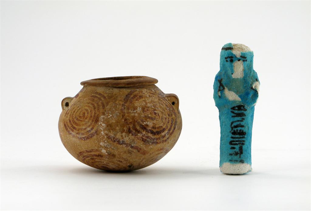 An Egyptian predynastic pottery jar, decorated with spiral motifs, c.3500 BC and a turquoise ushabti, probably 21st dynasty, wear and damages, 10.5cm max. (2)