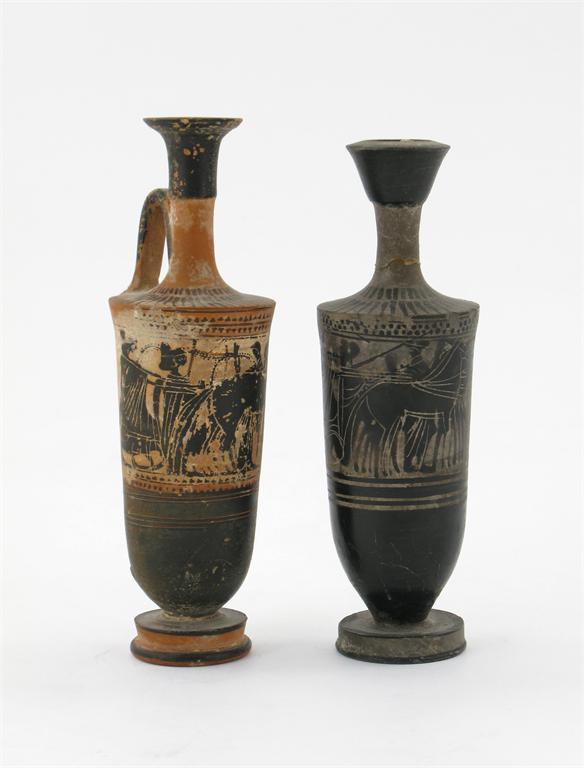 Two Attic Lekythos, both decorated with classical processions, both c. 5th century BC, extensive damages, 19cm. (2) Provenance: The Ernest Ohly collection.