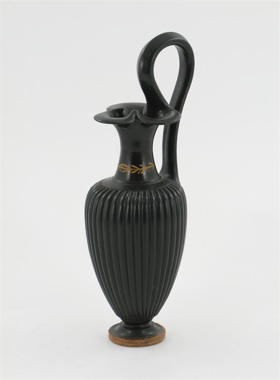 An Attic black glazed trefoil oinochoe, with a vertically ribbed ovoid body and high arched handle, the neck decorated with a garland of leaves, 4th-5th century BC, a repaired body crack, 16.6cm.