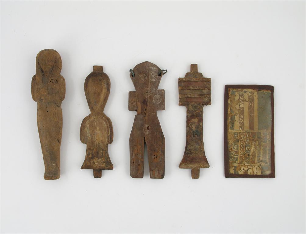 Four wooden carvings, one formed as an ushabti, another carved as a tyat knot, another a Djed pillar, the fourth carved as a crude figure, together with an Egyptian painted textile fragment, 21.5cm max. (5)