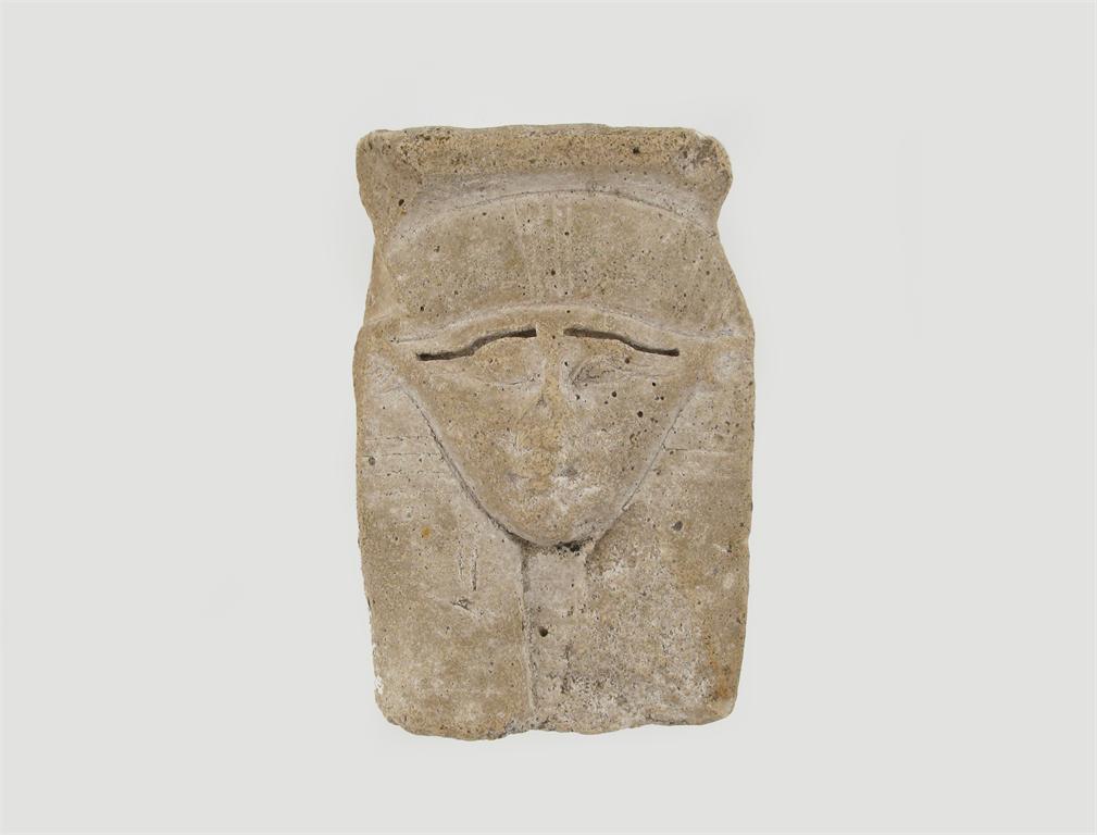 An Egyptian limestone plaque of the head Hathor, the reverse carved with a bird, c.600 BC, 9cm. Provenance: The Cecil Eric Britten Best collection, 1882-1973.