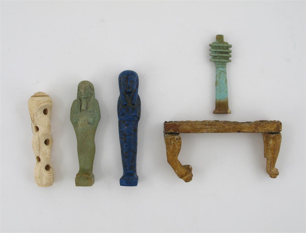 Two Egyptian ushabti, one in green faïence the other a blue glass figure together with a carved ivory handle, a small wooden table or stand and a turquoise glazed model of a pillar, damages, 13cm max. (5)