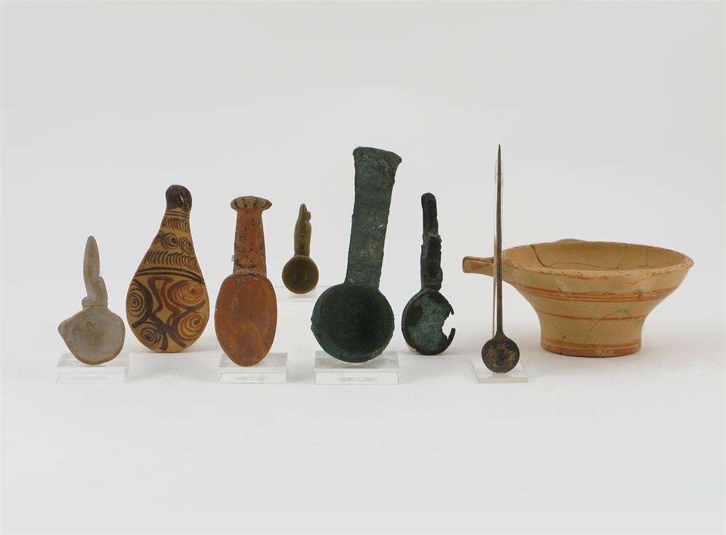 Seven various spoons in pottery, bronze and stone, and a bowl with a pouring lip, probably Cypriot, old wear and damages, 14.5cm max. Four with modern perspex stands. (8)