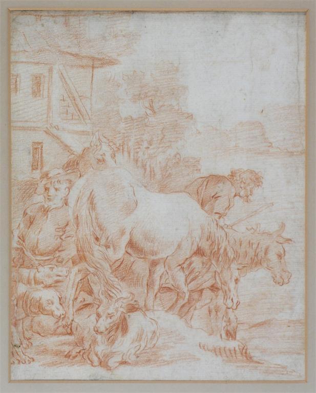 Follower of Nicolaes Berchem Figures with farm animals Red chalk 33.5 x 18.5cm; 13¼ x 7¼in