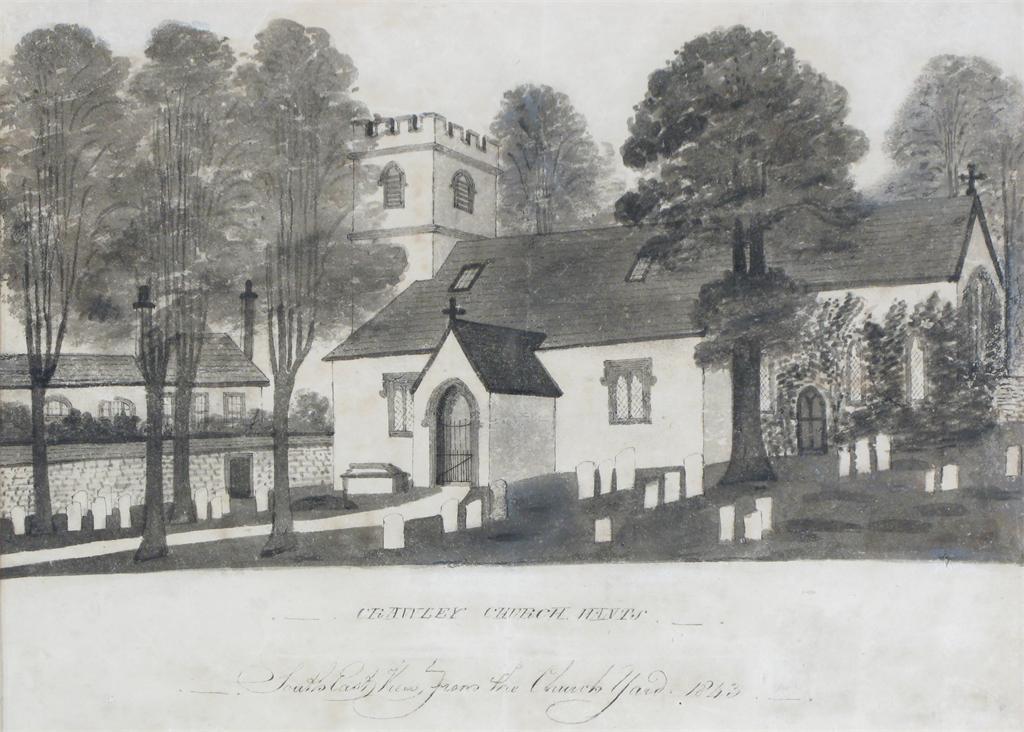 English School 1843 Crawley Church, Hampshire Dated 1843 and inscribed South East View from the Churchyard Grisaille watercolour 23 x 31cm; 9 x 12in