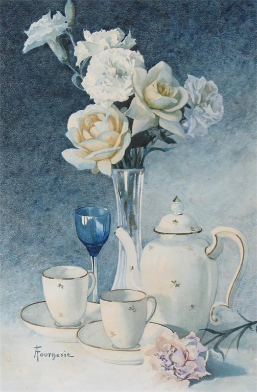 A. Fournerie (French early 20th Century) Still life of roses, cups and a teapot Signed Watercolour 50 x 33cm; 19¾ x 13in