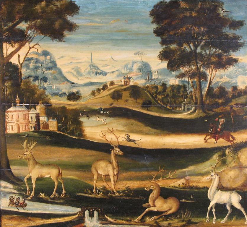 North European School 18th Century Deer in a fantastic landscape Oil on panel 74 x 81cm; 29 x 32in