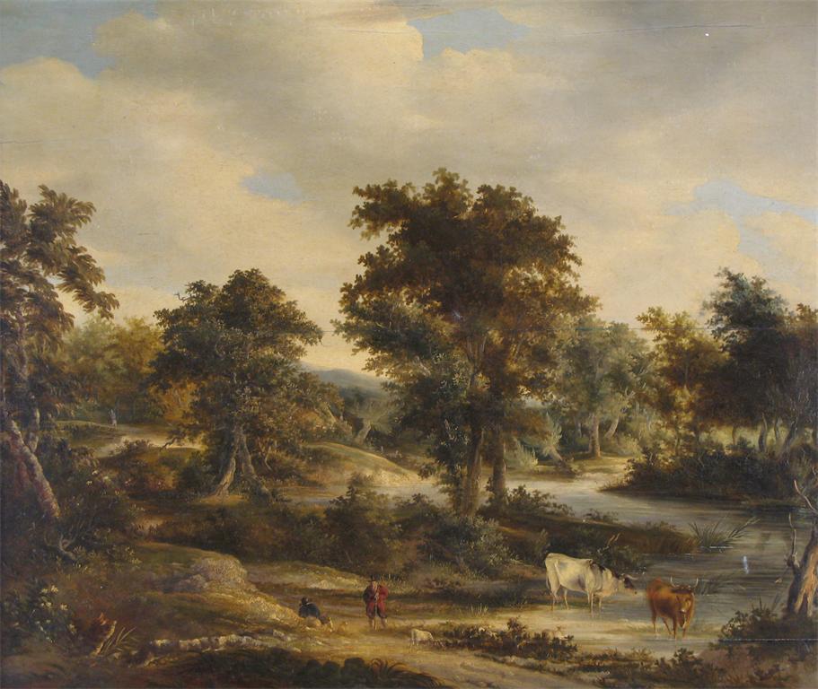 Dutch School c.1800 Rustics and cattle in a wooded landscape Oil on panel 60 x 71cm; 23½ x 28in