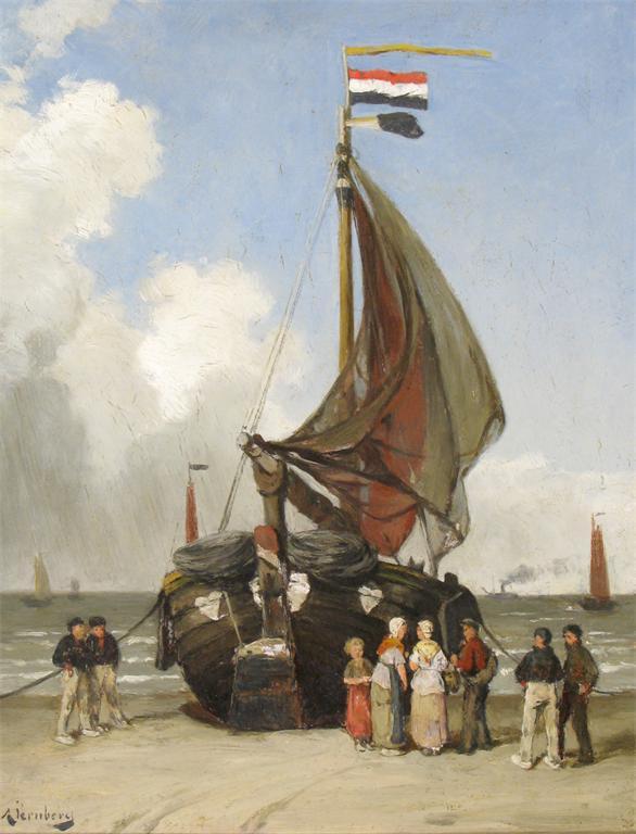 August Jernberg (Swedish 1826-1896) Figures by a fishing boat on the shore Signed Oil on panel...