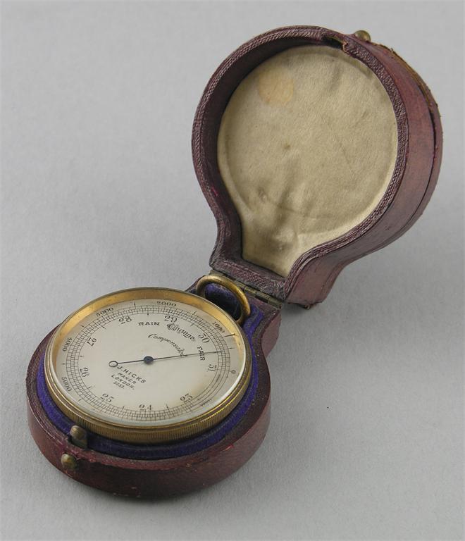 A gilt brass pocket aneroid barometer, by J.Hicks, London, No. 5083, with a needled bezel, 2in (5cm) dia. and an ivory mounted thermometer with mother-of-pearl compass, in a fitted case. Compass dial broken.