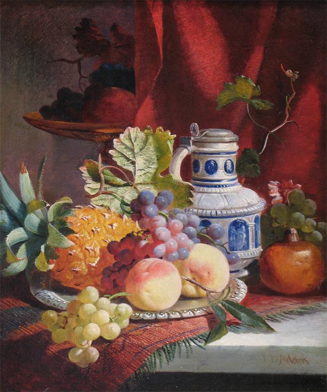 Joseph Denovan Adam (1842-1896) Still life of fruit and a stoneware vase on a ledge Signed