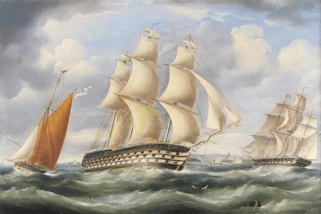 English School 19th Century Sailing ships off the coast a Harbour beyond Oil on canvas 53 x 77cm;...