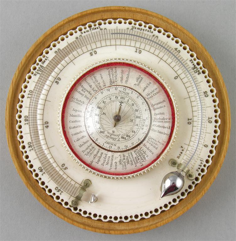 A George IV turned ivory sundial, compass and thermometer by T. Staight, London, with printed card dial, the outer ring with world cities and islands, 4.25in (10.8cm) dia. The under side with pen inscription in French dated 1829. Thomas Staight is listed by Gloria Clifton in Directory of British Scientific Instrument Makers 1550-1851, as working 1829-1860 making barometers, thermometers and ivory turner.