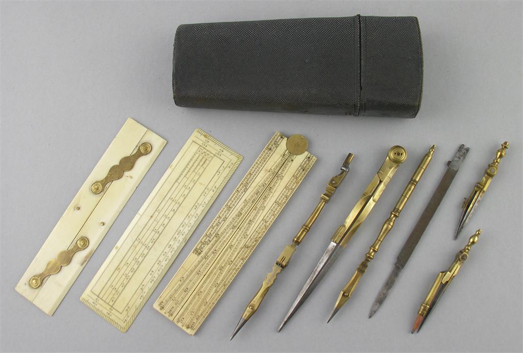A George II drawing instrument set, in a shark skin case opening to reveal a pair of compasses with interchangeable pen, pencil and spike, two smaller compasses, a drawing pen, a knife/file, an ivory and brass parallel rule, a folding foot rule and a protractor.