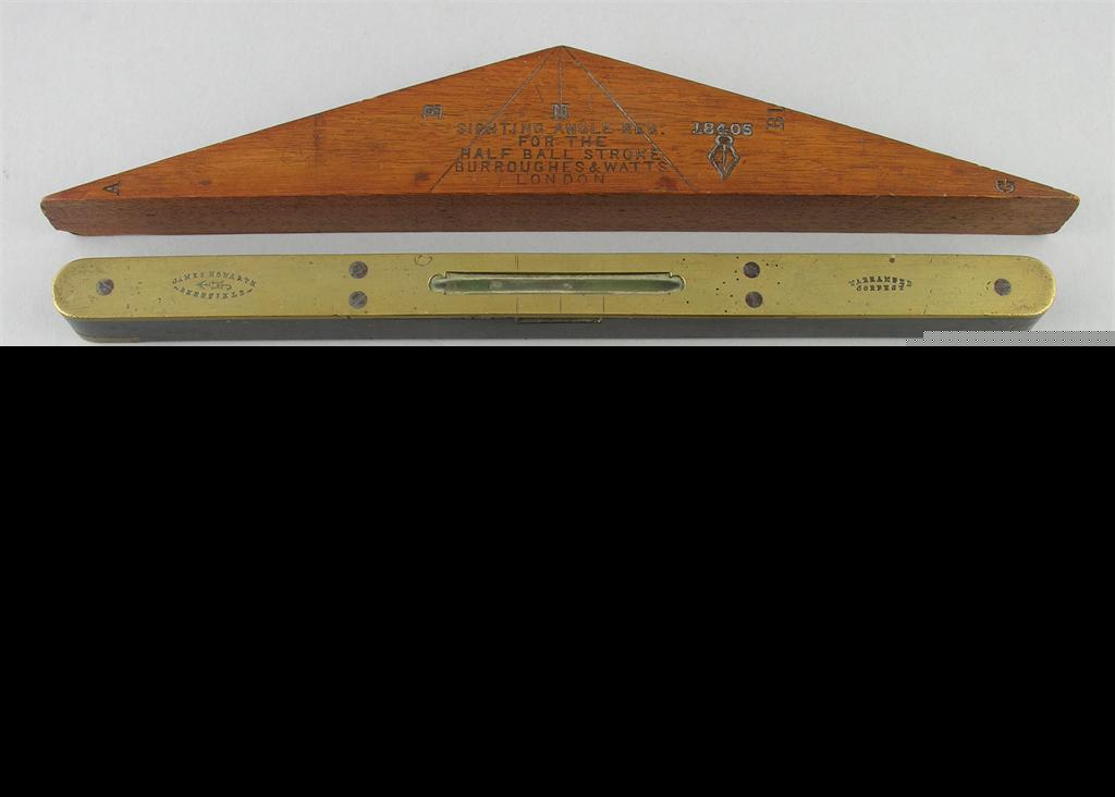 A Burroughes & Watts mahogany 'Sighting Angle For The Half Ball Stroke', Reg 18405, 12.5in (31.7cm) w, a James Howarth, Sheffield brass and ebony spirit level, a brass cased 'Lawn Tennis Measure' 78ft, the front with the correct measurements and a brass and steel tobacco cutter. (4)