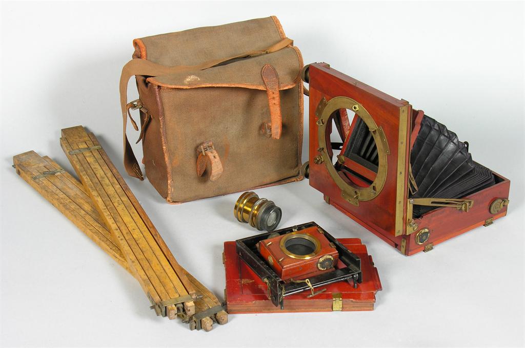 A Thornton Pickard Triple "Imperial" Extension mahogany and brass plate camera, with a Beck Symmetrical Lens, 8in (20.2cm) w. a plate holder, part tripod and a carrying case.
