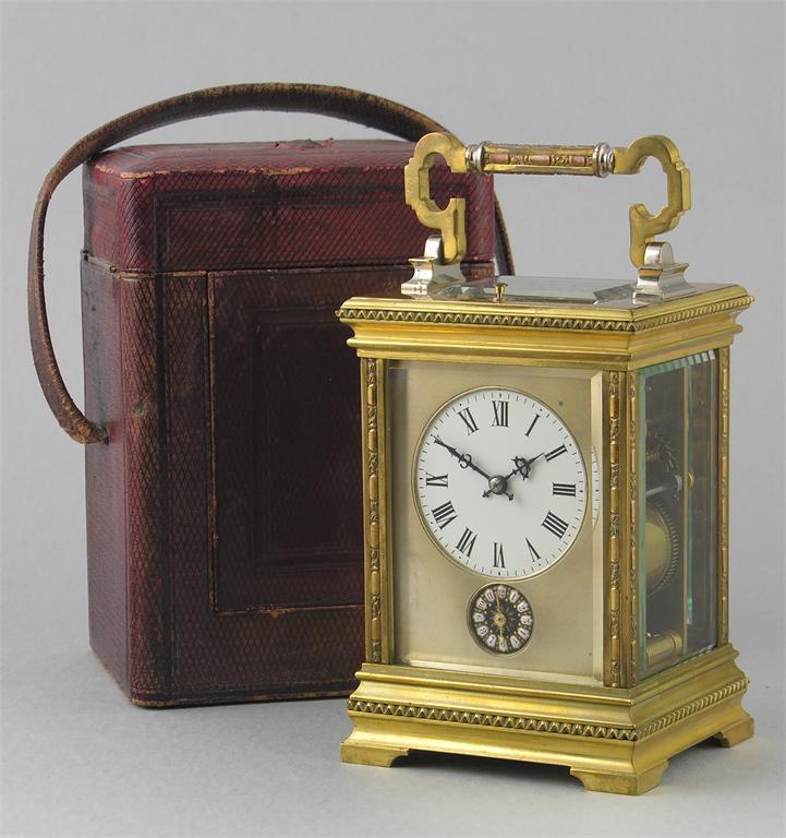 A French gilt brass Grand Sonnerie carriage clock, the platform lever escapement striking on two gongs to a circular dial and an enamelled alarm dial, the underside lever engraved 'Gde Sonnerie; Pte Sonnerie; Silence', 7.75in (19.5cm) h. in an associated travel case. (2)