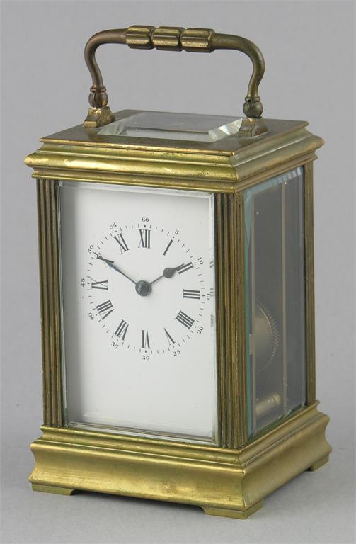 A French brass cased carriage clock, the later platform lever escapement striking on a gong, to an enamel dial, 7.25in (18.4cm) h. winding key. Dial cracked and two panes with chips.