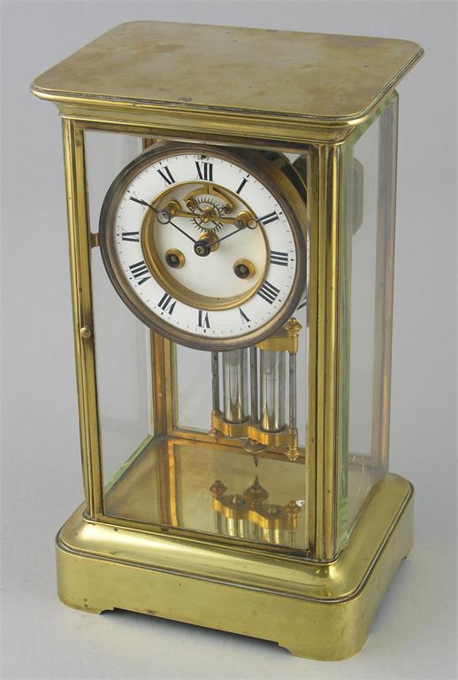 A late 19th century French gilt brass four glass mantel clock, the 8 day movement striking on a gong, the enamel dial with a visible Brocot escapement (left arm missing), with a mercury compensated pendulum, 13in (33cm) h, 7.75in (19.5cm) w. a winding key.