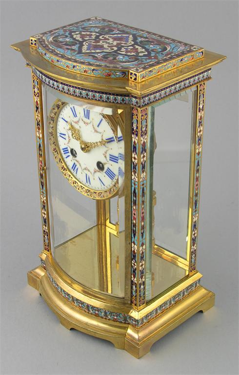 A late 19th century French bowfront gilt brass and champleve enamel four glass mantel clock