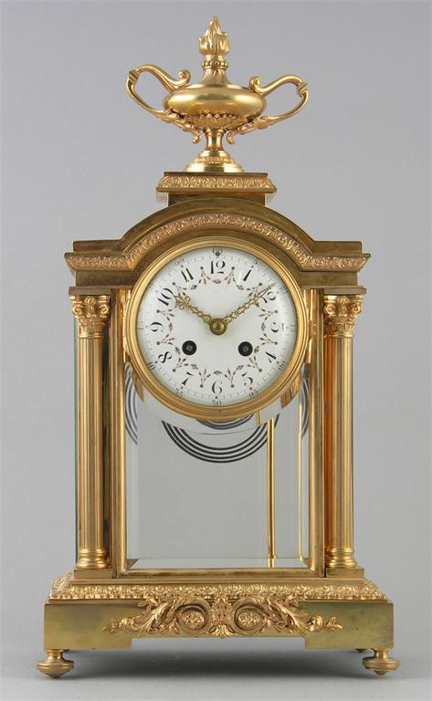 A French brass arch four glass mantle clock, the 8 day movement striking on a gong to a painted enamel dial, 18in (45.7cm) h, 9.5in (24cm) w, 6in (15cm) d. A later pendulum, the case re-gilded.