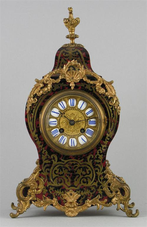 A 19th century French ebonised and boulle front mantel clock, the 8 day movement with an outside count wheel, stamped 'Schmull, Paris,' and striking on a bell, the dial with painted Roman numeral cabochons, 14.75in (37.5cm) h.