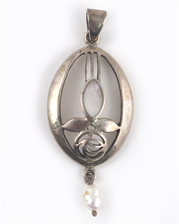 A continental silver pendant wirework form with mother of pearl and freshwater pearl drop stamped...