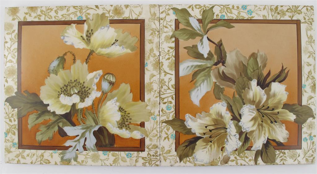 Two Doulton Lambeth tiles each painted with opium pottery flowers in shades of white and green on...