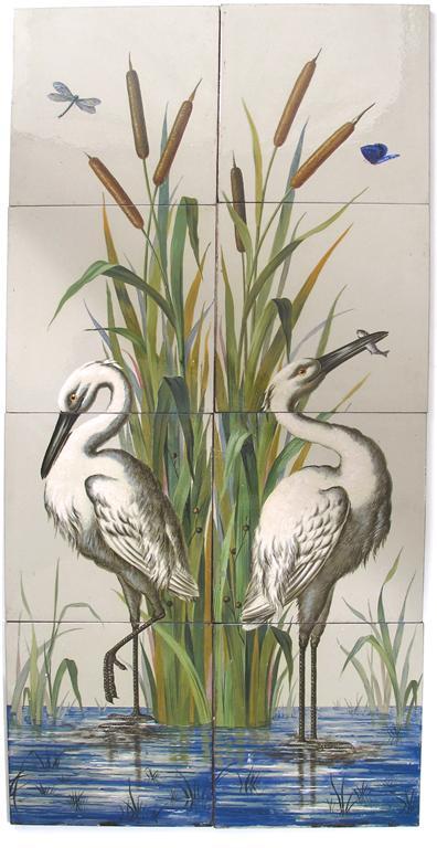 A pair of Aesthetic Movement Minton Hollins four tile panels each painted with a egret standing...