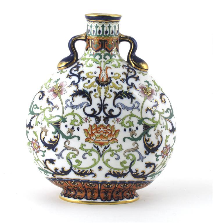 A porcelain moonflask probably by Minton printed and enamelled in colours and gilt with...