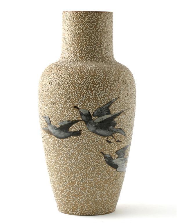 A Doulton Lambeth stoneware vase by Florence Barlow, pate sur pate decorated with flying gulls on an abstract slip decorated ground impressed mark and incised artists marks 29cm. high