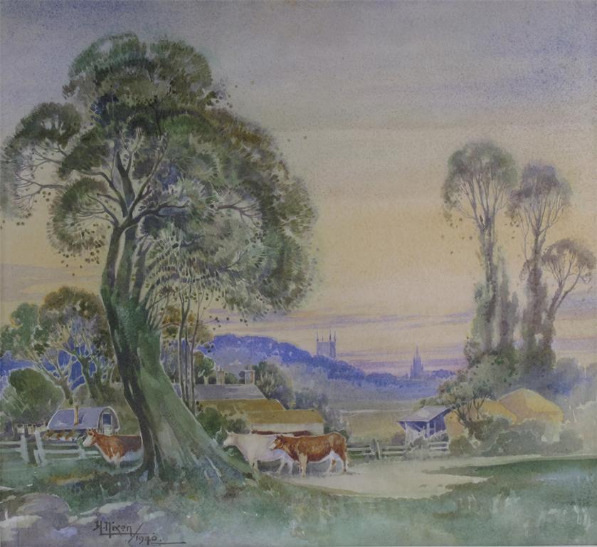 'Cattle in a meadow' a watercolour by Harry Nixon, dated 1940, framed signed and dated image 42 x 38.5cm.