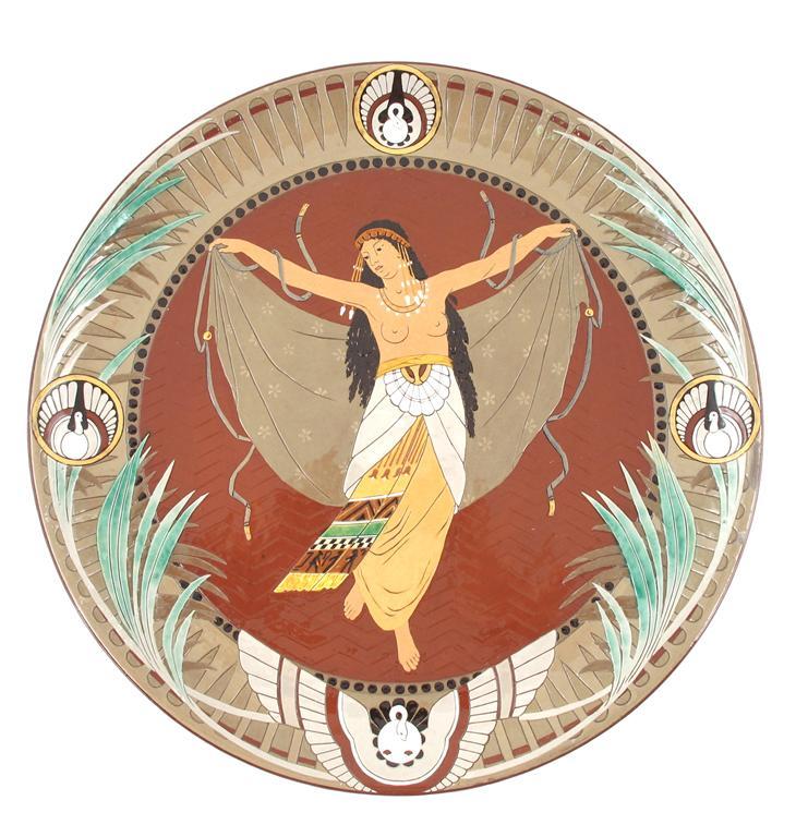 An interesting Aesthetic Movement Minton charger slip decorated with an Egyptian dancer to the well