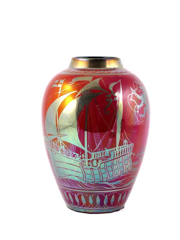 A large Pilkington's Lancastrian Pottery vase by William S Mycock, dated 1909, painted in golden lustre with a four galleons at full sail, on a vivid red ground impressed and painted marks, painted cypher and datecode 30cm. high