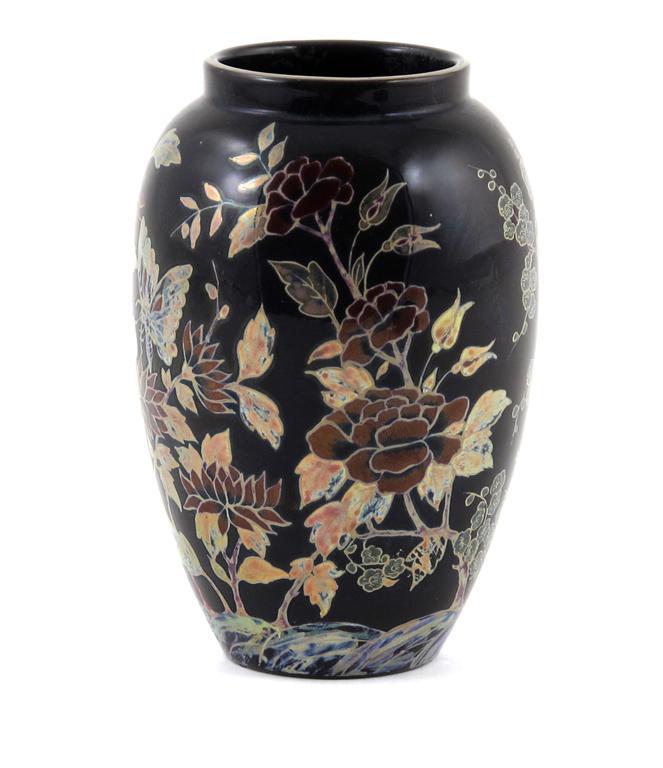 A Zsolnay Pecs pottery vase shouldered form, painted in copper and ruby lustre on a black ground with sprays of blossom and a flying butterfly printed marks 13cm. high