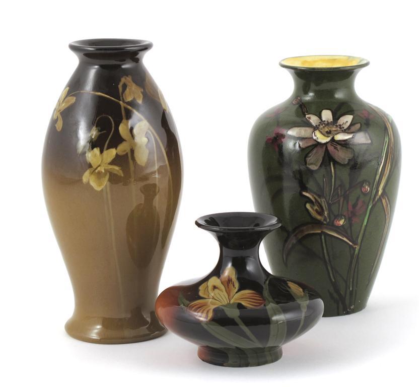 A Lonhuda Pottery, Denver vase shouldered form with everted rim, painted with cyclamen flower, in shades of brown, yellow and white, and two other vases similar impressed marks 18cm. high