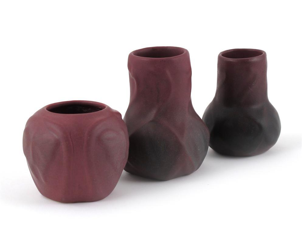 A Van Briggle pottery vase modelled in low relief, glazed matt pink, another smaller and a Van Briggle shouldered vase similar incised marks 11.5cm. high