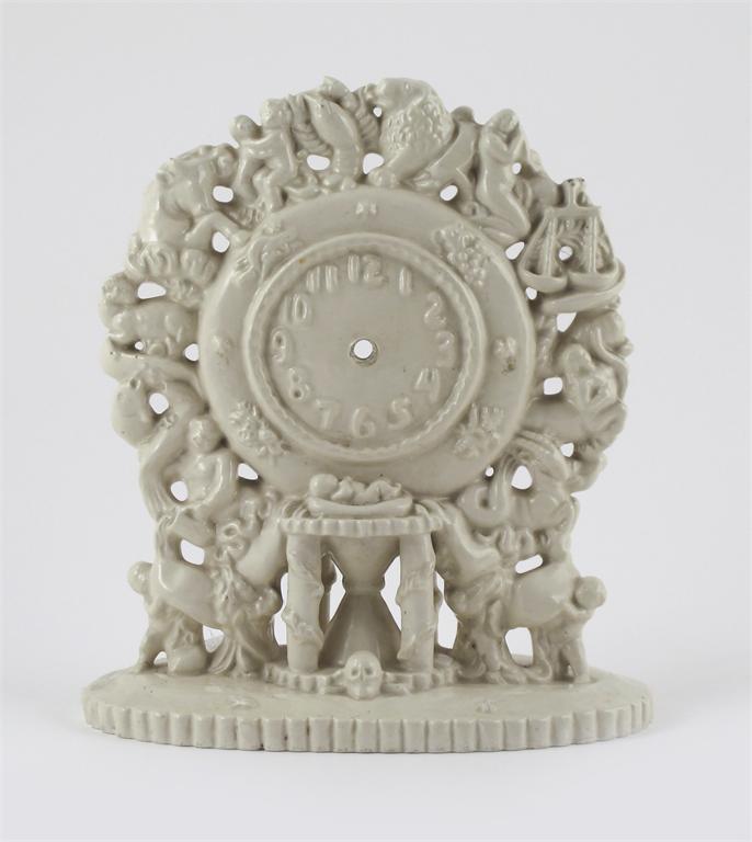 A Willi Russ pottery mantle clock modelled in relief with the signs of the zodiac, a skull and crossbones at the base, glaze cream signed in the casting 26cm. high