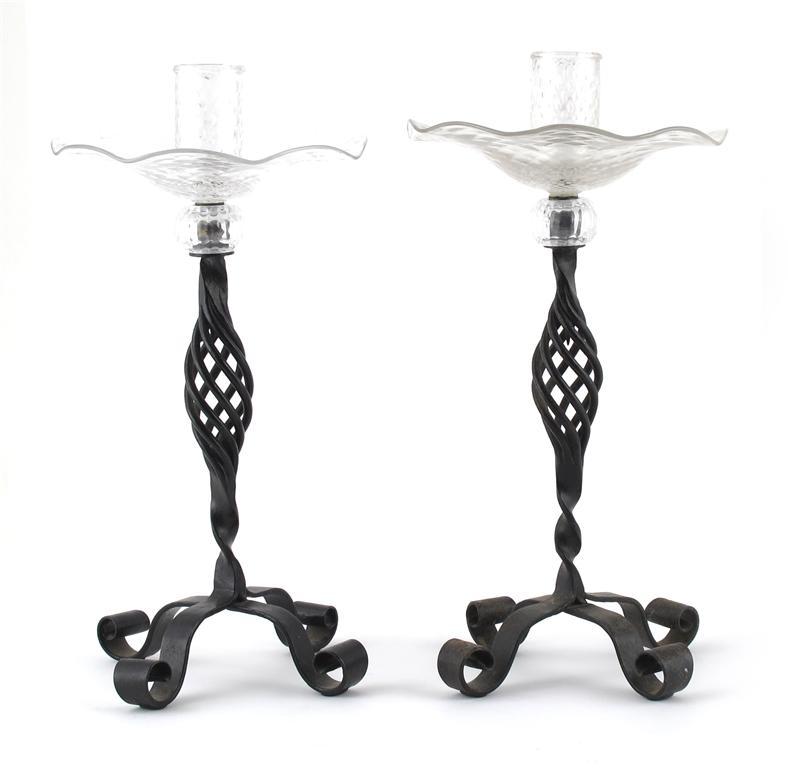 A pair of James Powell & Sons, Whitefriars glass and wrought iron candlesticks, unsigned 31cm. high