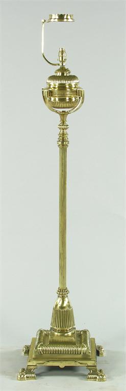 A brass adjustable standard lamp, the oil reservoir fitted a later electric socket, 62.5in (159cm) h.