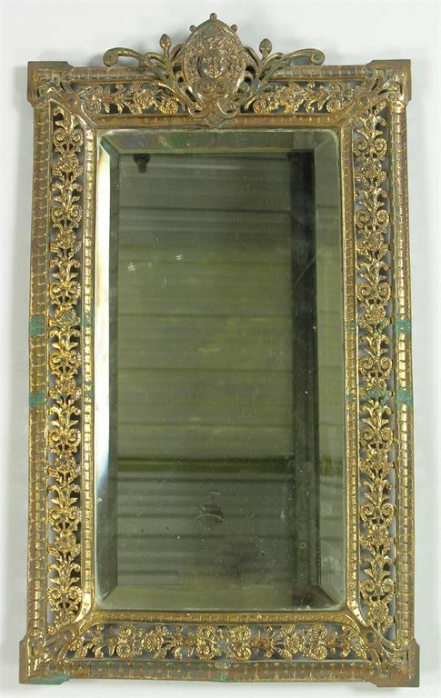 A pair of late 19th century cast brass wall mirror, with bevelled plates to foliage frames and an applied mask surmount, 18.75 x 11in (47.5 x 28cm). One cleaned. (2)